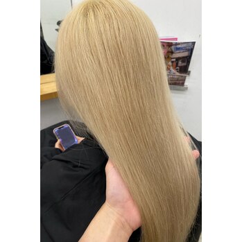 定期的な周期で来ていただいてるお客様!今回はリタッチのみだったので毛先の残留に合わせて根元のブリーチと馴染むように軽くくすませる程度で色を入れてます!パキパキのブロンドもいいですがこれくらい少しくすんでるくらいのブロンドも肌に馴染んでいいです!