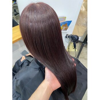 深めワインレッド!室内では暗く自然光ではしっかり色味が分かります!ベースはある程度明るくないと色味が出ませんのでベースが8tone以下、又は暗めのカラーをされたことのある方はダブルカラーをオススメします!赤系はブリーチなしのダブルカラーでもこれくらいの色味は出せますのでご相談ください!